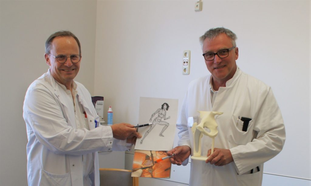 v.l. Dr. Christoph Konermann (Leiter Orthopädie 2) und Dr. Arne Fittje (Chefarzt Orthopädie, Unfallchirurgie und Wirbelsäulenchirurgie) erläutern die kleine Schnittführung zum Einsetzen eines künstlichen Hüftgelenkes nach der AMIS Methode.