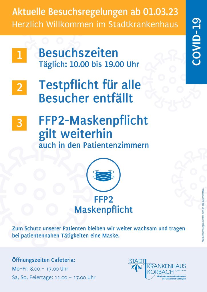 Zum 1. März 2023 werden auch im Stadtkrankenhaus Korbach weitere Corona-Schutzmaßnahmen gelockert. So brauchen Sie als Besucher des Stadtkrankenhauses keinen negativen Corona-Test mehr durchführen. Auch die 3 Mal wöchentliche Testpflicht für unsere Mitarbeiter entfällt. Lediglich bei vorhandenen Symptomen erfolgen Mitarbeiter-Testsungen. Wir freuen uns, dass damit weitere Lockerungen möglich sind.